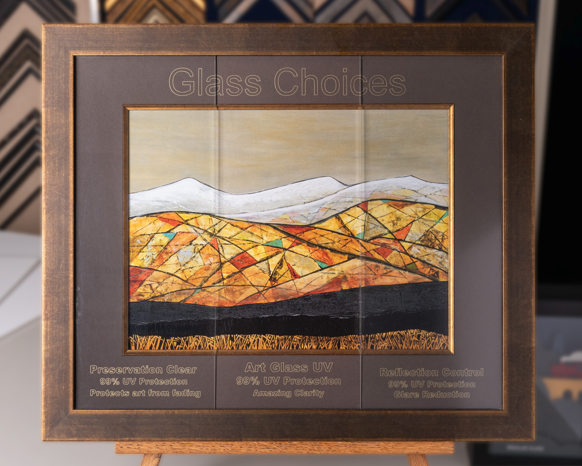 If you’d like help deciding which glazing option best suits your artwork, please call or drop in—we’re happy to guide you through the options. We have samples in our gallery so you can see each type in action before making your choice.